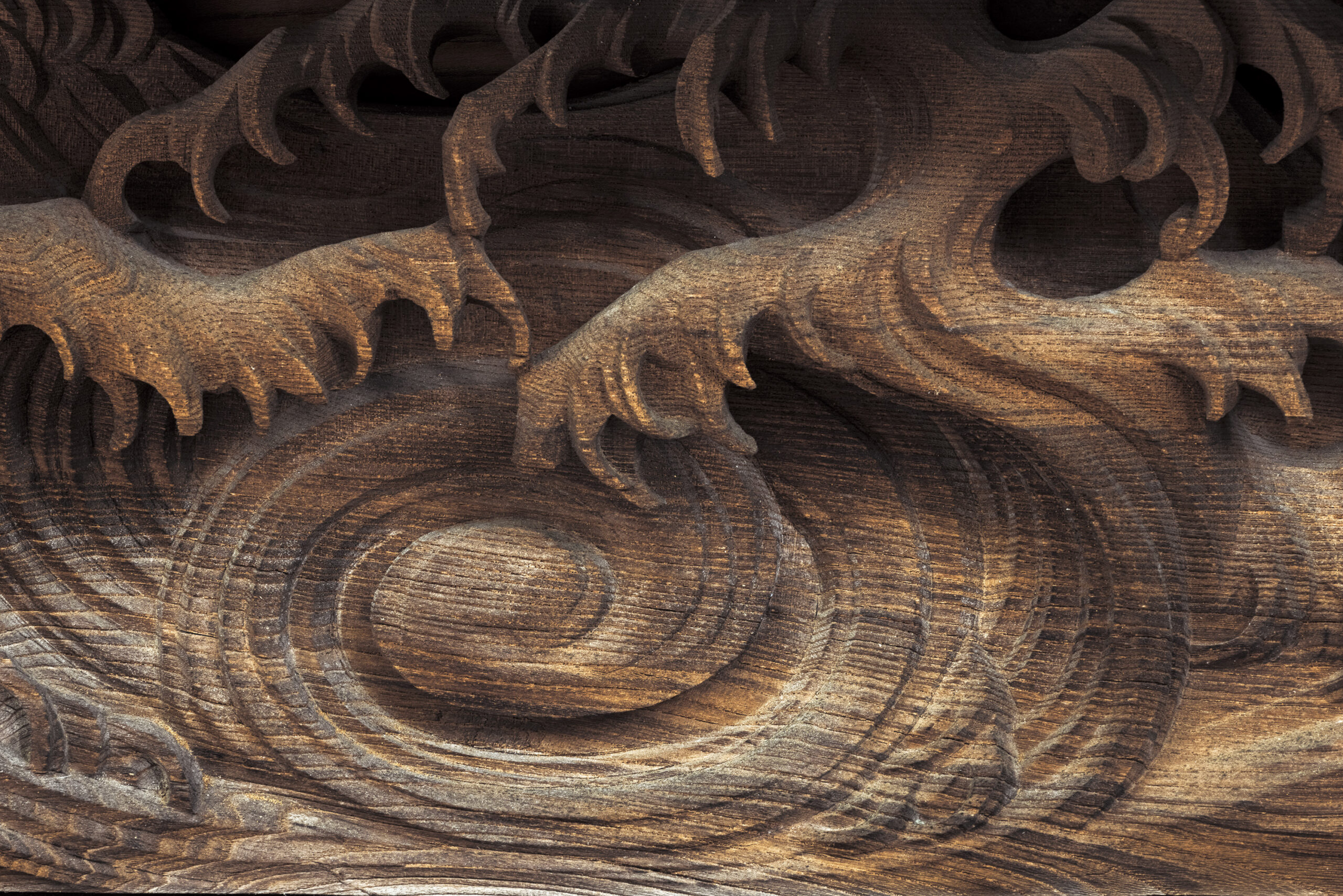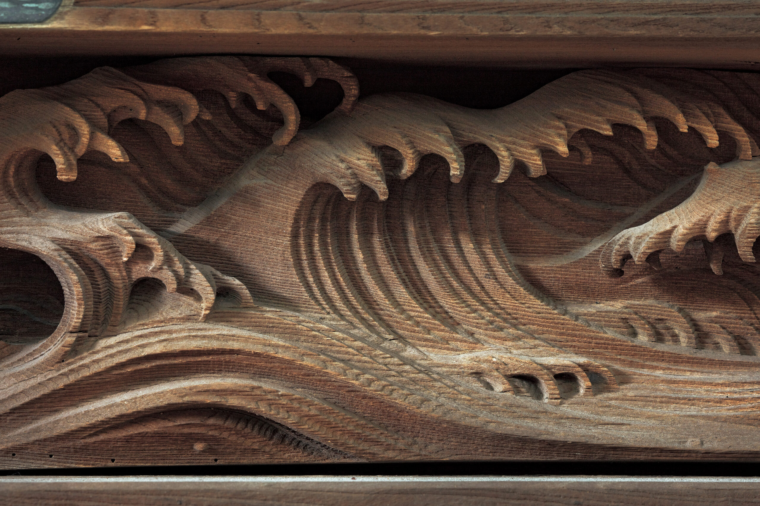 川越氷川神社の本殿は江戸時代後期に当時の川越藩主である松平斉典(まつだいらなりつね)公と氏子の寄進により造営されました。本殿壁面には江戸彫とよばれる精巧な彫刻が施されており、この彫刻は当時の川越氷川祭の山車の上の人形と源氏の武将に関する物語が題材となっています。これらの彫刻は名工である嶋村源蔵と飯田岩次郎の手によるもので、彫刻を含む本殿全体が当神社に対する川越藩主をはじめ氏子の信仰の結晶というべきものです。
