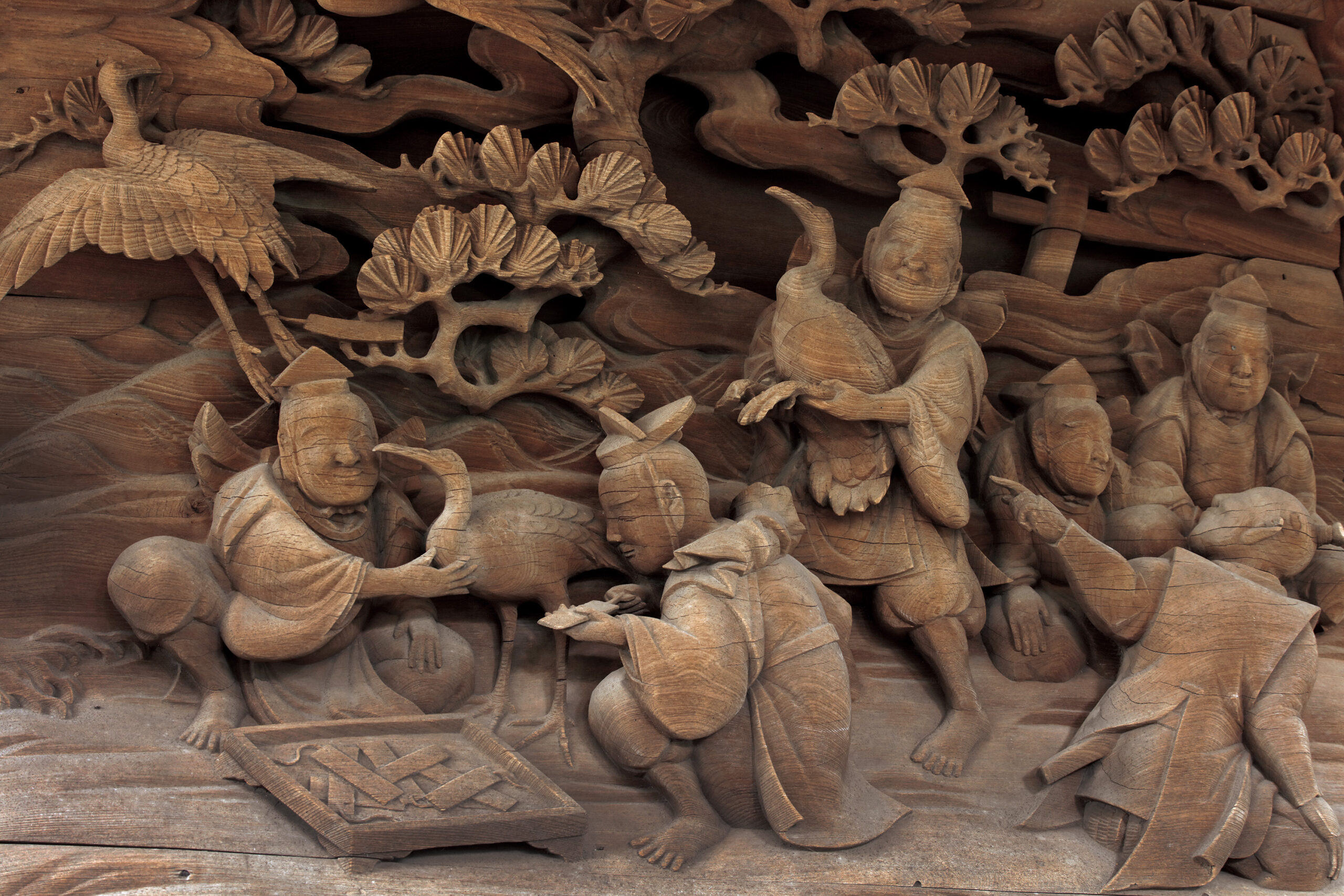川越氷川神社の本殿は江戸時代後期に当時の川越藩主である松平斉典(まつだいらなりつね)公と氏子の寄進により造営されました。本殿壁面には江戸彫とよばれる精巧な彫刻が施されており、この彫刻は当時の川越氷川祭の山車の上の人形と源氏の武将に関する物語が題材となっています。これらの彫刻は名工である嶋村源蔵と飯田岩次郎の手によるもので、彫刻を含む本殿全体が当神社に対する川越藩主をはじめ氏子の信仰の結晶というべきものです。
