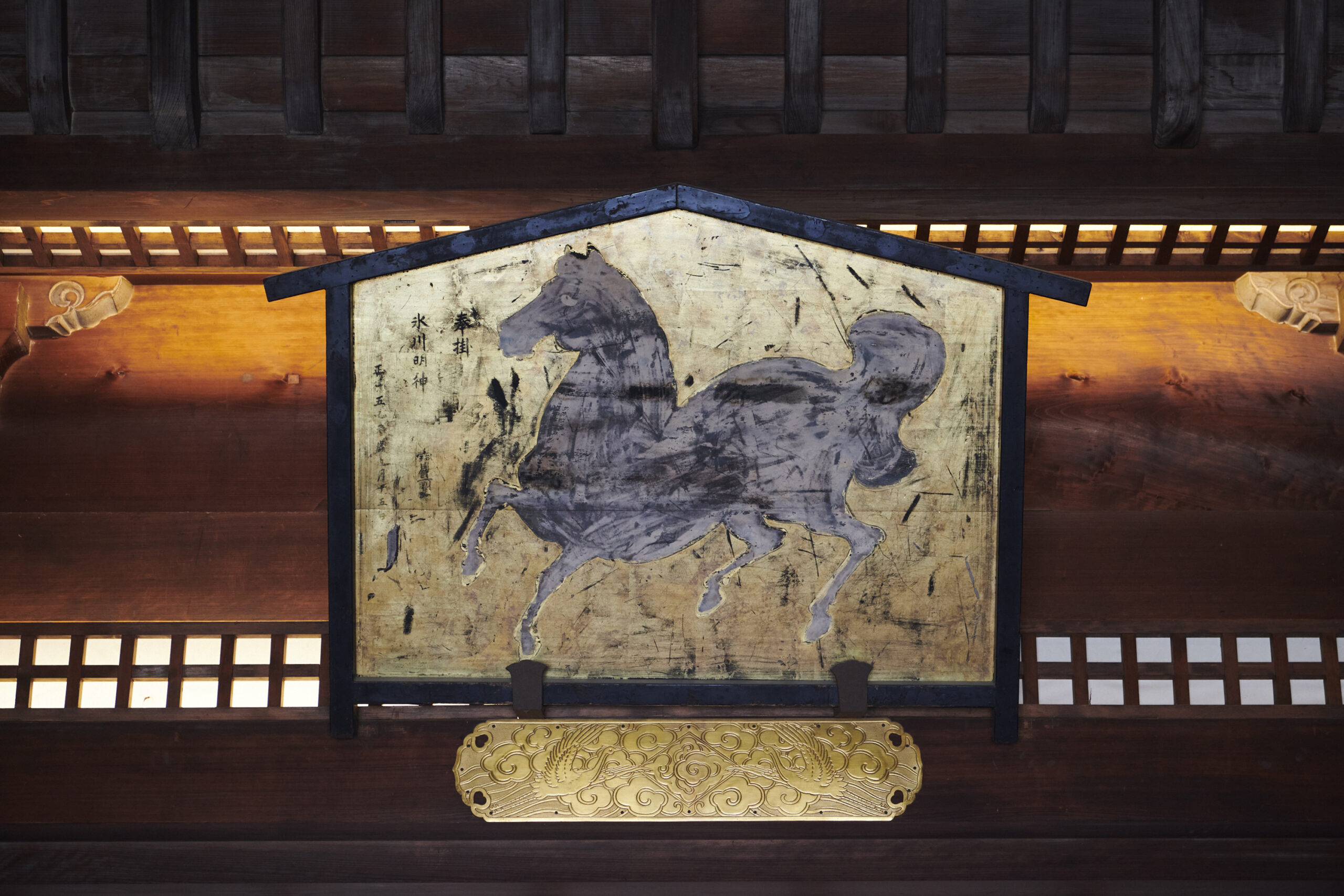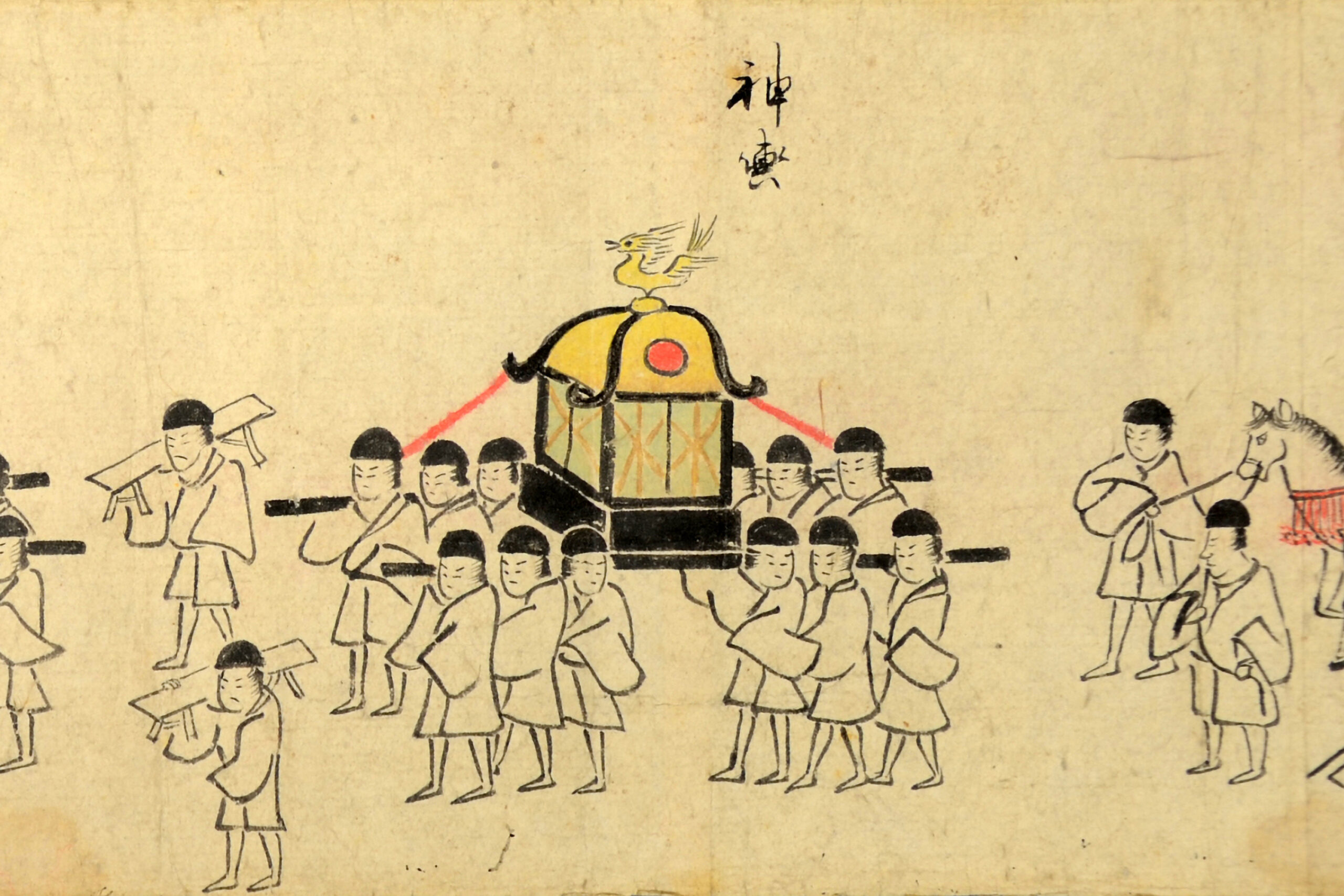 神幸祭において神様に供奉するのは人だけではありません。それが馬です。神社や神道と馬には深い関わりがあるのです。馬はかつては移動や運搬に利用され、人間の生活にはなくてはならない存在でした。馬は神様の乗り物とされており、神馬(しんめ)とよばれます。古代より神前に馬を献上する習わしがあり、現代においても馬を飼育している神社もあります。平安時代頃から、それを馬の人形や板に馬を描いて代用するようになりました。馬の絵を描いた板なので「絵馬」なのです。絵馬堂という大型の絵馬を掛けるための建物をもつ寺社も存在します。
