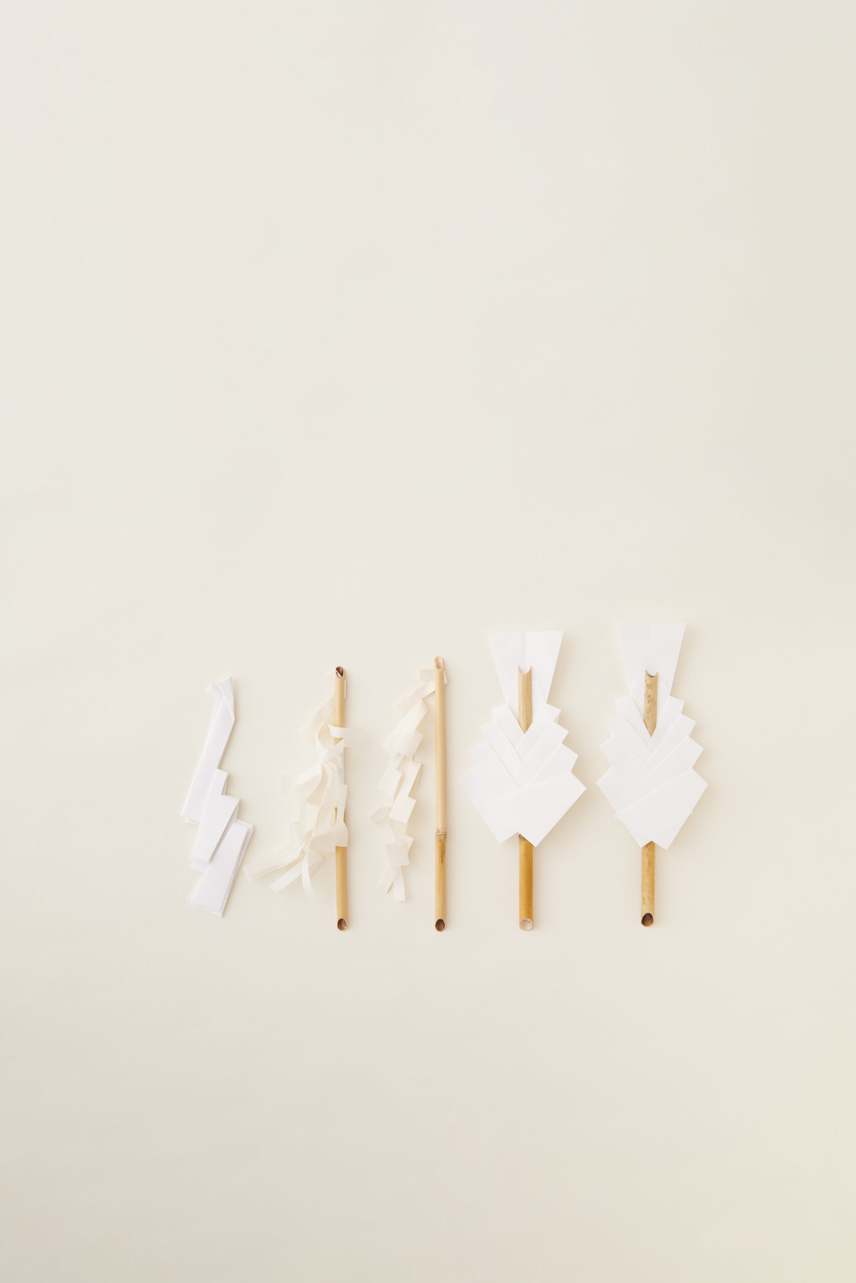 注連縄に付ける紙で紙垂(しで)ともいいます。神聖な場所を示す結界を意味します。